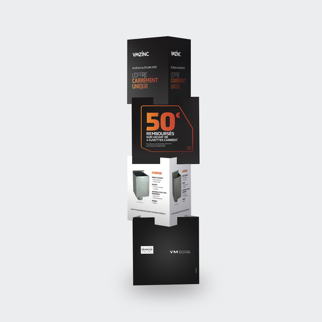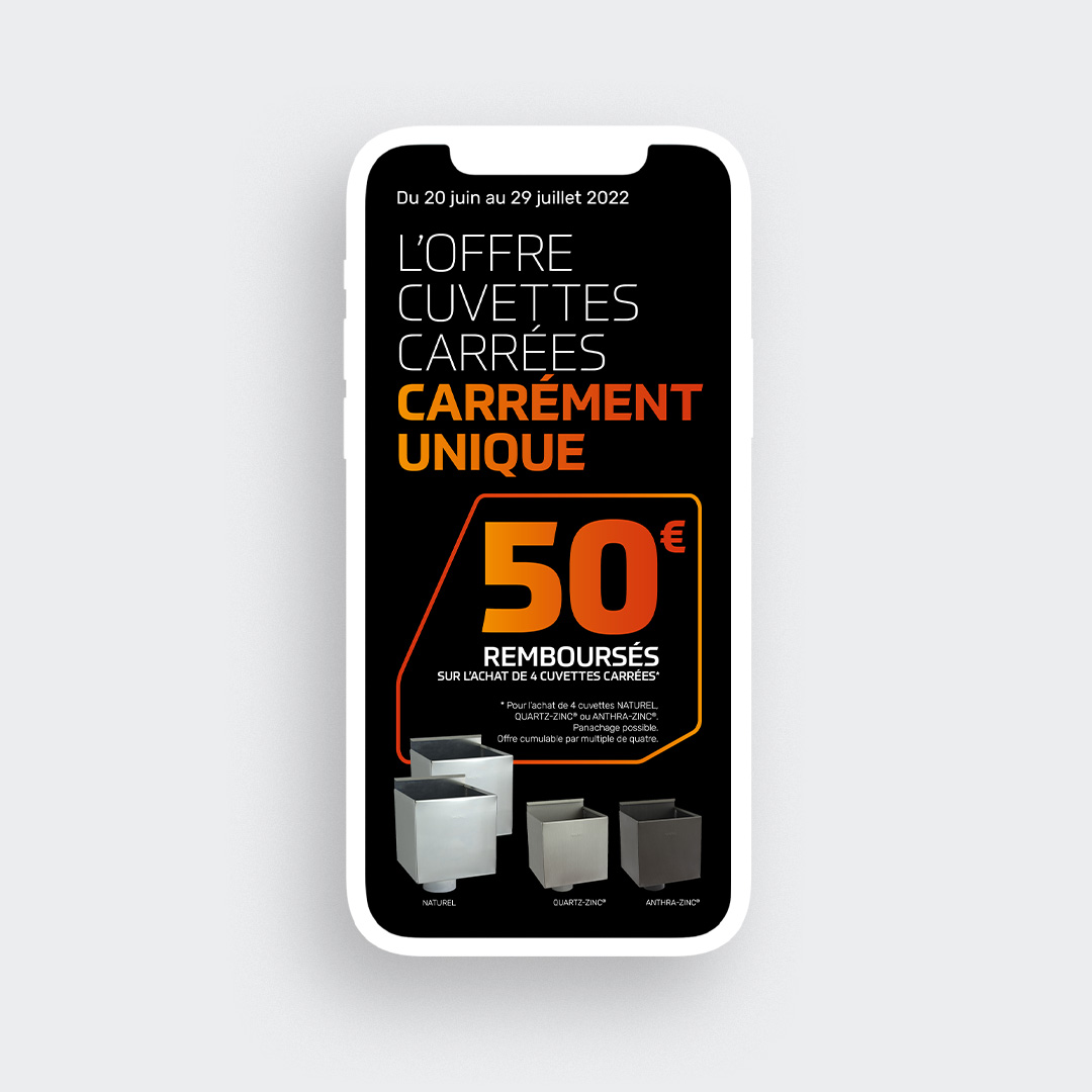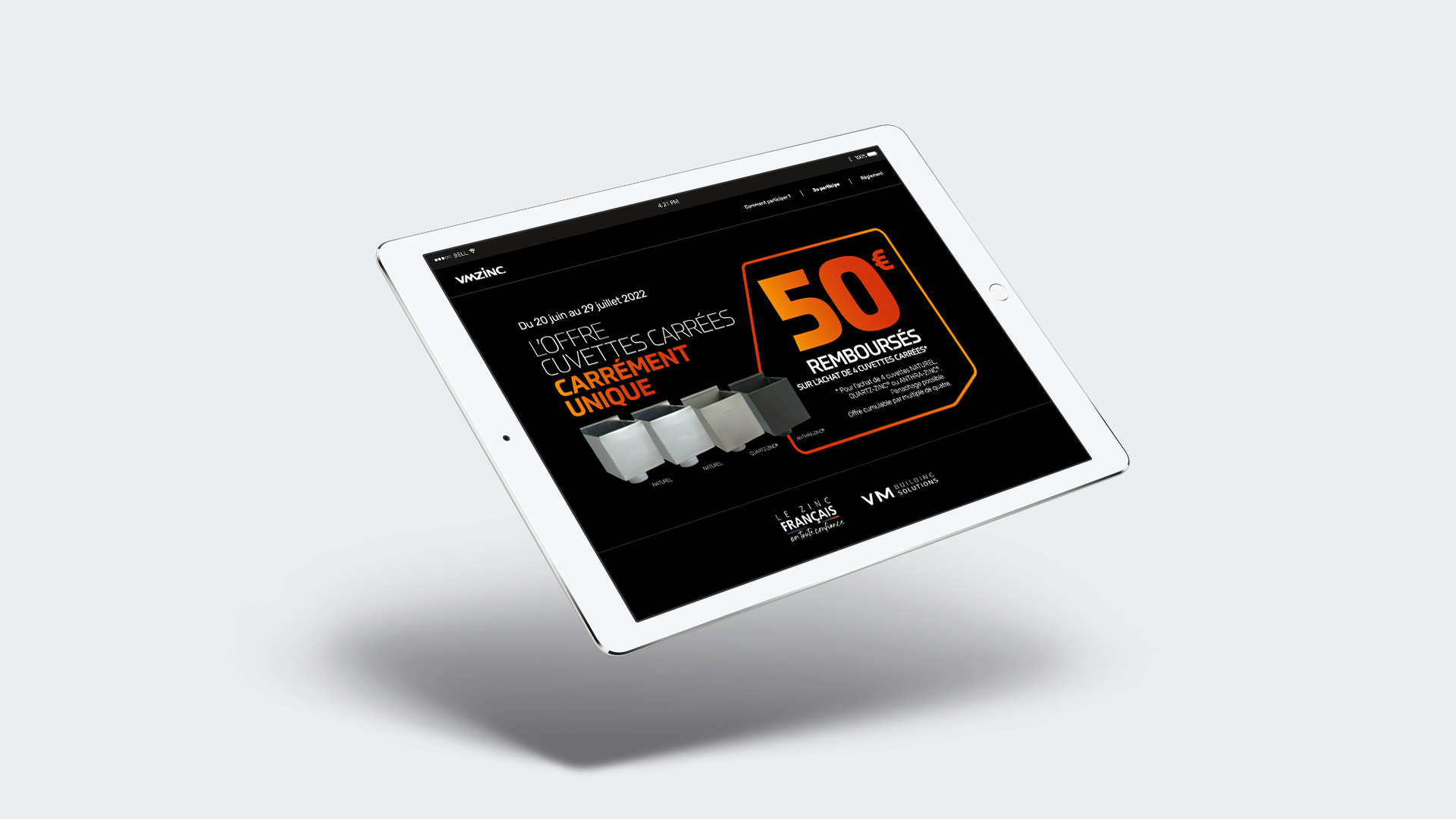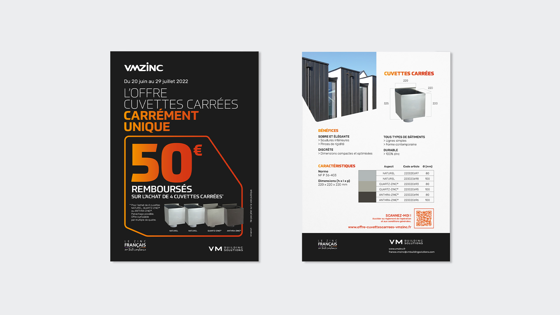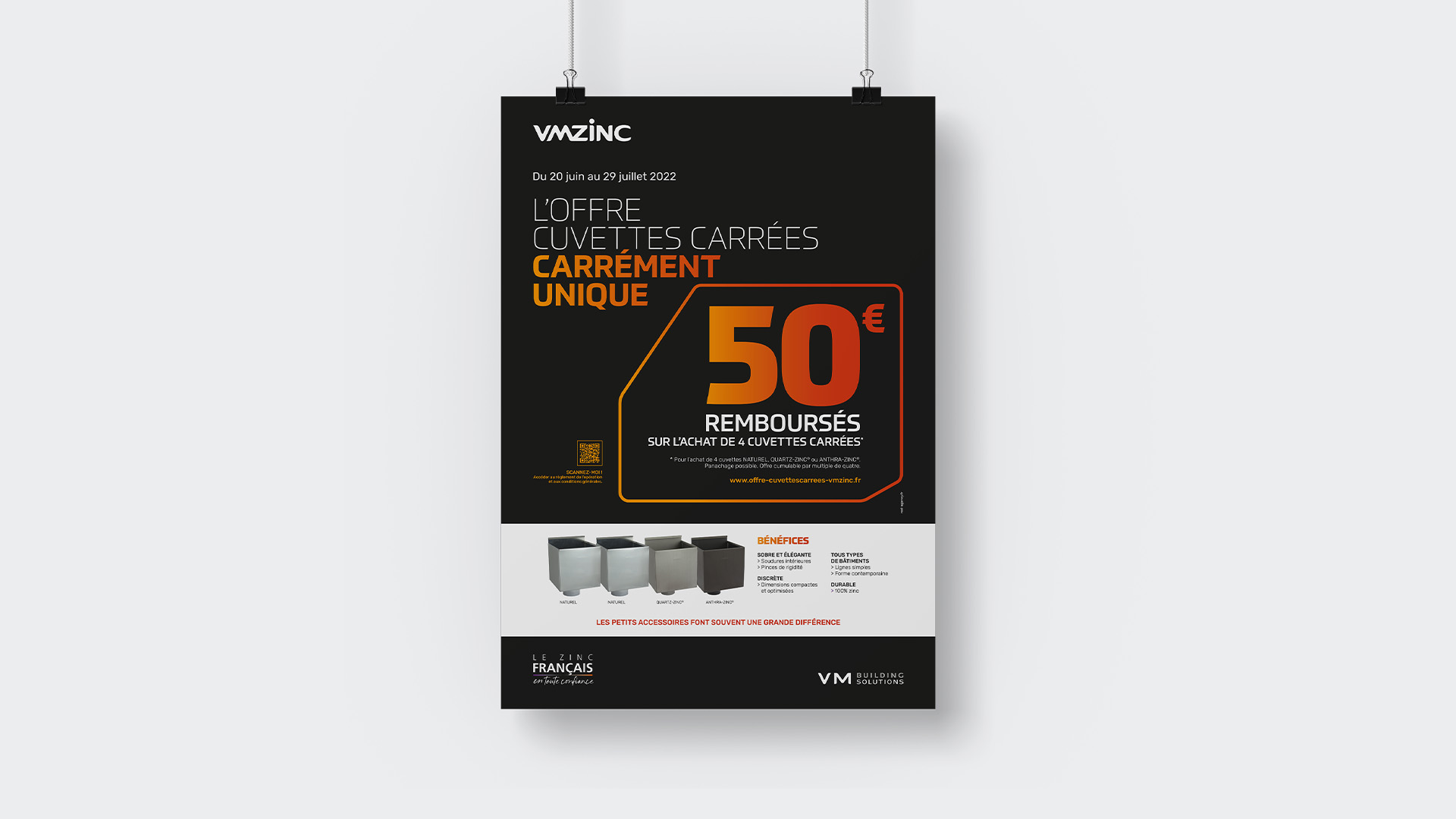 VM BUILDING SOLUTIONS est une société qui commercialise des solutions en zinc laminé sous la marque VMZINC®, présente depuis plus de 180 ans sur le marché du zinc. Elle propose une offre large et complète de solutions pour la façade, la couverture, la collecte des eaux pluviales, les accessoires et les ornements haut de gamme. VM BUILDING SOLUTIONS a confié à RED AGENCY la conception et l’activation d’une opération promotionnelle auprès de son réseau de distributeurs qui s’adresse aux installateurs et plus particulièrement aux entreprises de couverture. L’objectif de l’activation : Animer, dynamiser l’offre « Cuvette carrée » et augmenter les ventes avec une offre de remboursement (ODR) : pour 4 cuvettes achetées, 50€ remboursés.