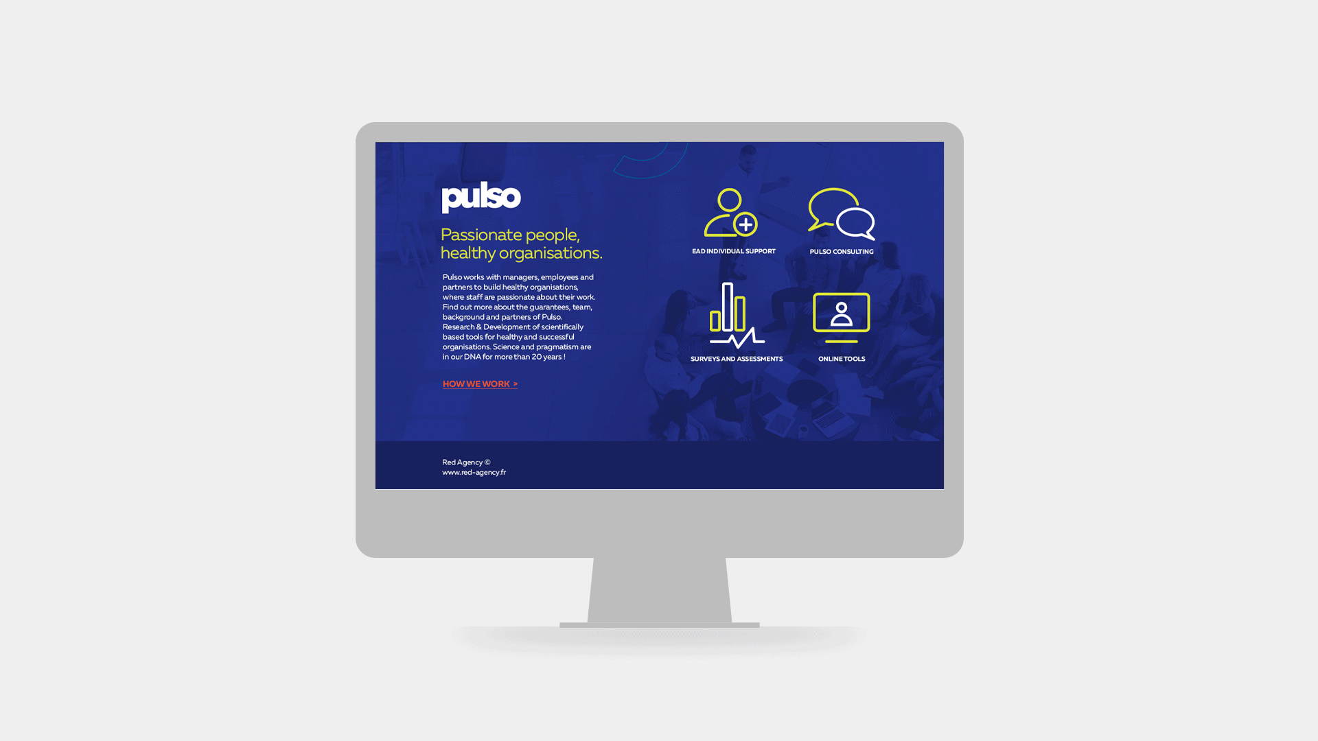 PULSO est une entreprise spécialisée dans le bien-être psychosocial au sein des organisations. Grâce à une panoplie d'outils et de compétences, la mission de PULSO est de travailler en concertation avec les dirigeants, collaborateurs et partenaires pour bâtir des organisations saines, où la passion est au cœur du travail. PULSO crée et développe des applications innovantes pour aider les entreprises, à avoir une vision claire du bien-être des employés et adapter leurs actions. RED AGENCY accompagne PULSO dans la création du naming de ce tout nouvel outil spécifique. Puis, RED AGENCY conçoit et réalise une stratégie de communication, ainsi qu’un univers de marque pour faire connaître cette nouvelle application digitale en direction des DRH et des dirigeants des entreprises.