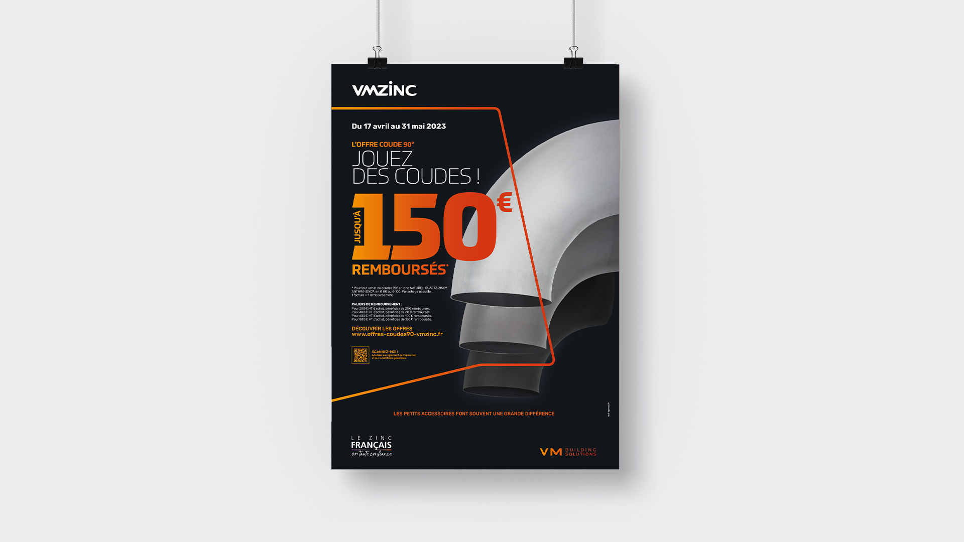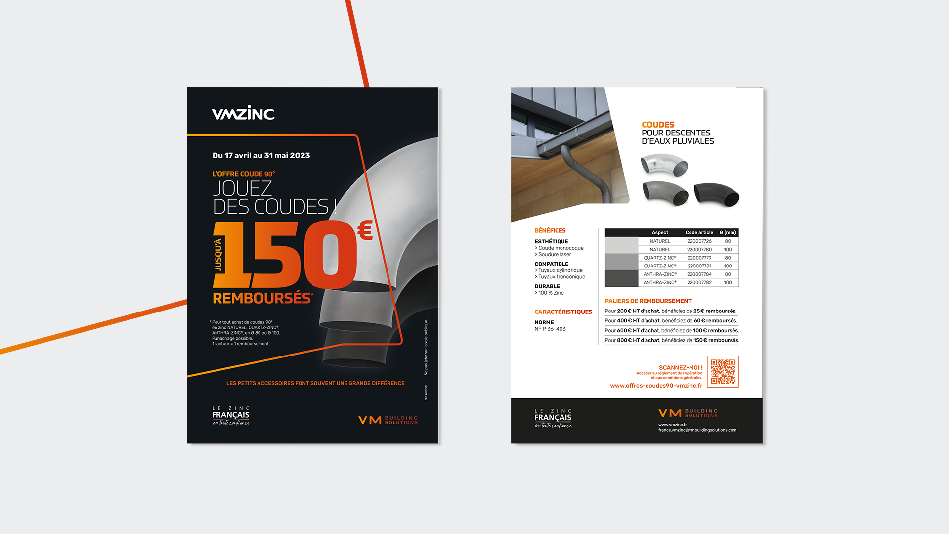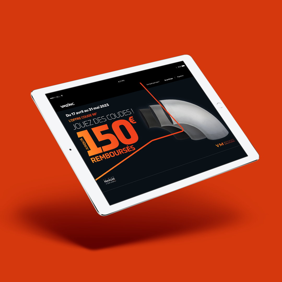 VM BUILDING SOLUTIONS a confié à RED AGENCY la conception et l’activation d’une opération promotionnelle auprès de son réseau de distributeurs qui s’adresse aux installateurs et plus particulièrement aux entreprises de couverture. L’objectif de l’activation : Animer, dynamiser l’offre « Coudes» et augmenter les ventes avec une offre de remboursement (ODR) : pour tout achat de coudes 90° achetées, jusqu’à 150€ remboursés (avec des paliers de remboursement).