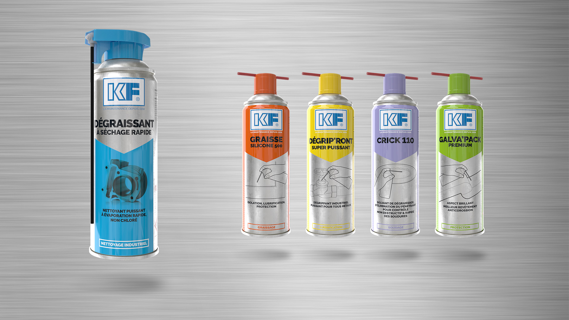 Depuis de 50 ans, KF est le leader français dans la fabrication et la distribution de produits chimiques destinés aux secteurs de l’industrie, du bâtiment, de la bureautique, de l’informatique et de l’électronique. Les produits KF répondent à tous les besoins en proposant 450 références, réparties en 9 gammes : la protection, la lubrification, le graissage, le soudage, l’assemblage et la fixation, le nettoyage industriel, la droguerie, le nettoyage de précision, les peintures. Les objectifs : Fidélité, confiance, l’utilisateur doit pouvoir se reposer sur la marque KF, Affirmer une posture de leader auprès de la distribution, Augmenter la valeur de la catégorie, Affirmer l’ADN de pionnier de KF qui est toujours à la pointe, aime les défis, qu’ils soient produits, services, commerciaux, environnementaux. Le parti-pris : VALORISER LA TÂCHE À EFFECTUER PAR LE PROFESSIONNEL Avec KF, vous pouvez vous appuyer sur des produits efficaces qui répondent parfaitement à vos besoins et contraintes.