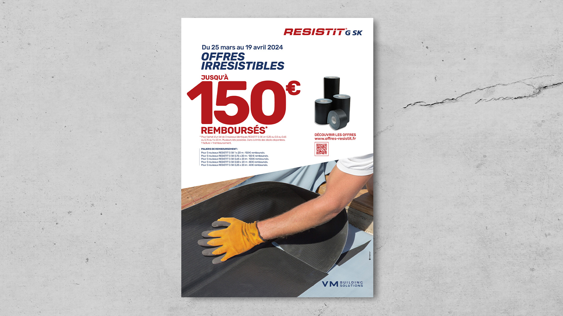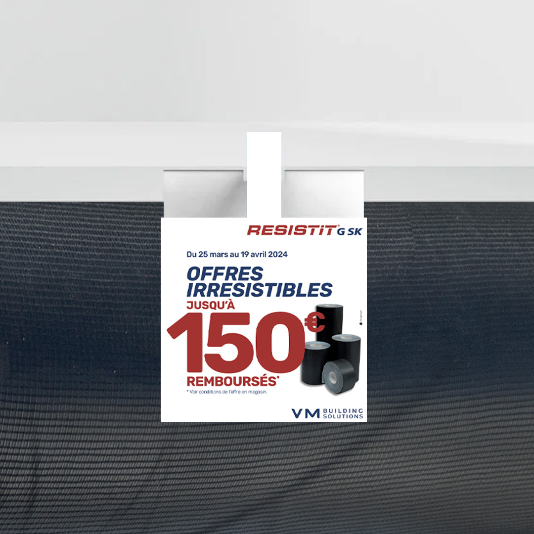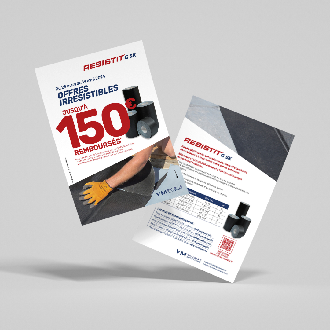 VM BUILDING SOLUTIONS a confié à RED AGENCY la conception et l’activation d’une opération promotionnelle auprès de son réseau de distributeurs qui s’adresse aux installateurs et plus particulièrement aux entreprises de couverture. L’objectif de l’activation : Animer, dynamiser l’offre Resistit G SK, bande EPDM armée pour réaliser l’étanchéité à l’air et à l’eau, et augmenter les ventes avec une offre de remboursement (ODR) : jusqu’à 150 € remboursés.